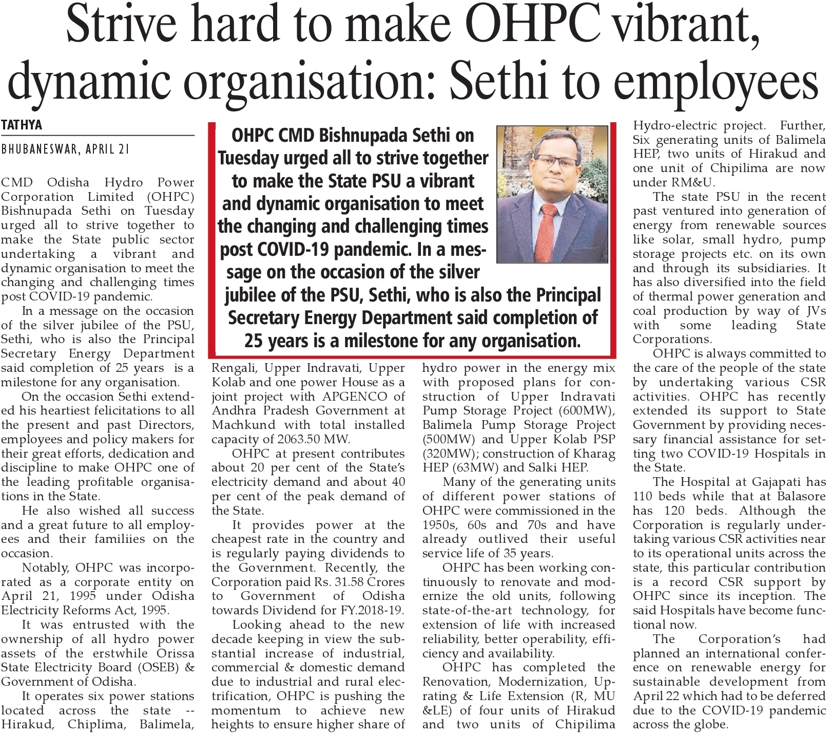 CMDs Message published on the eve of Silver Jubilee of OHPC.